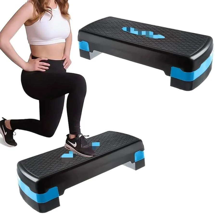 The class uses a small step to perform aerobic step exercises, adding a fun and calorie-burning element.